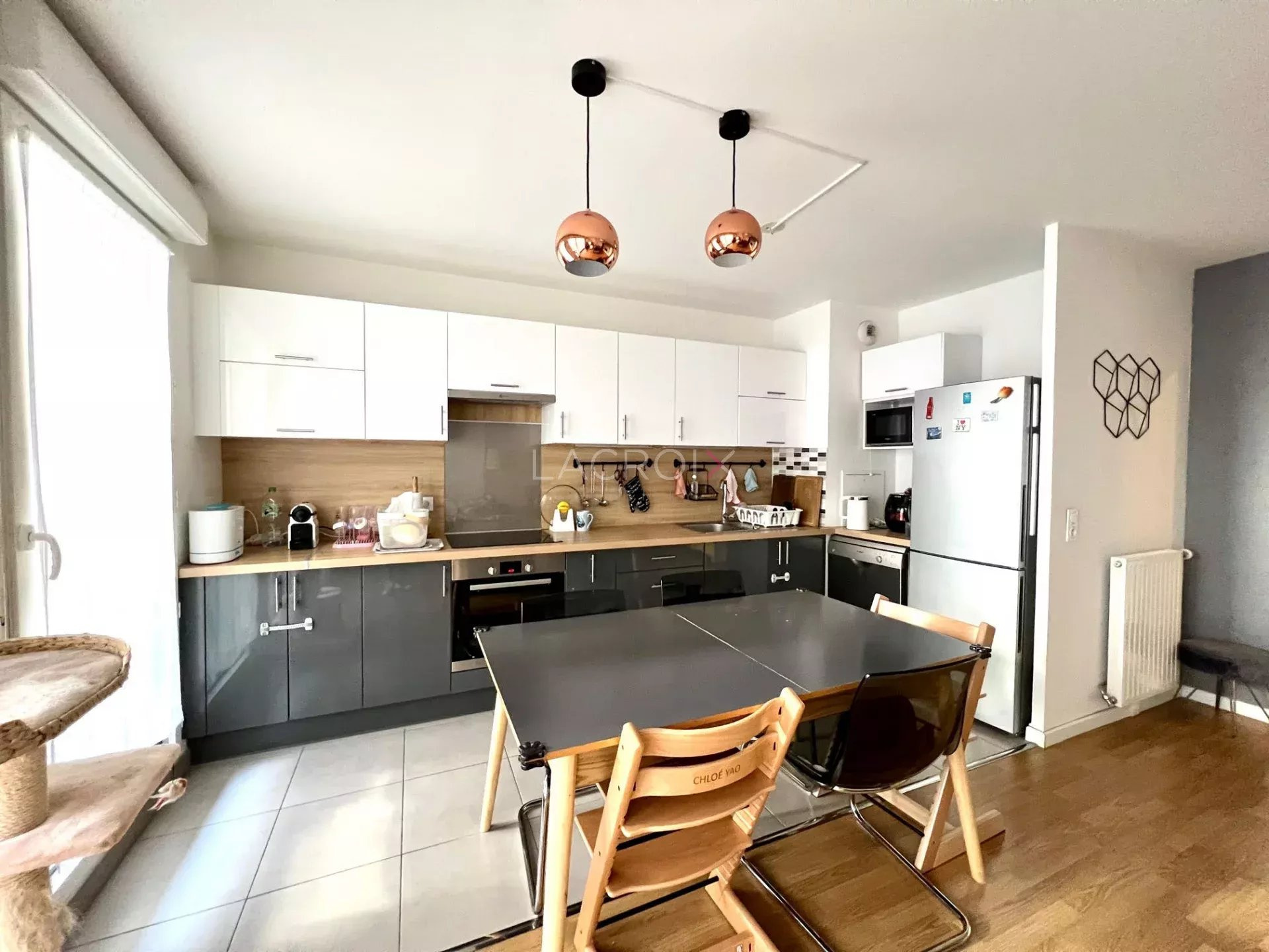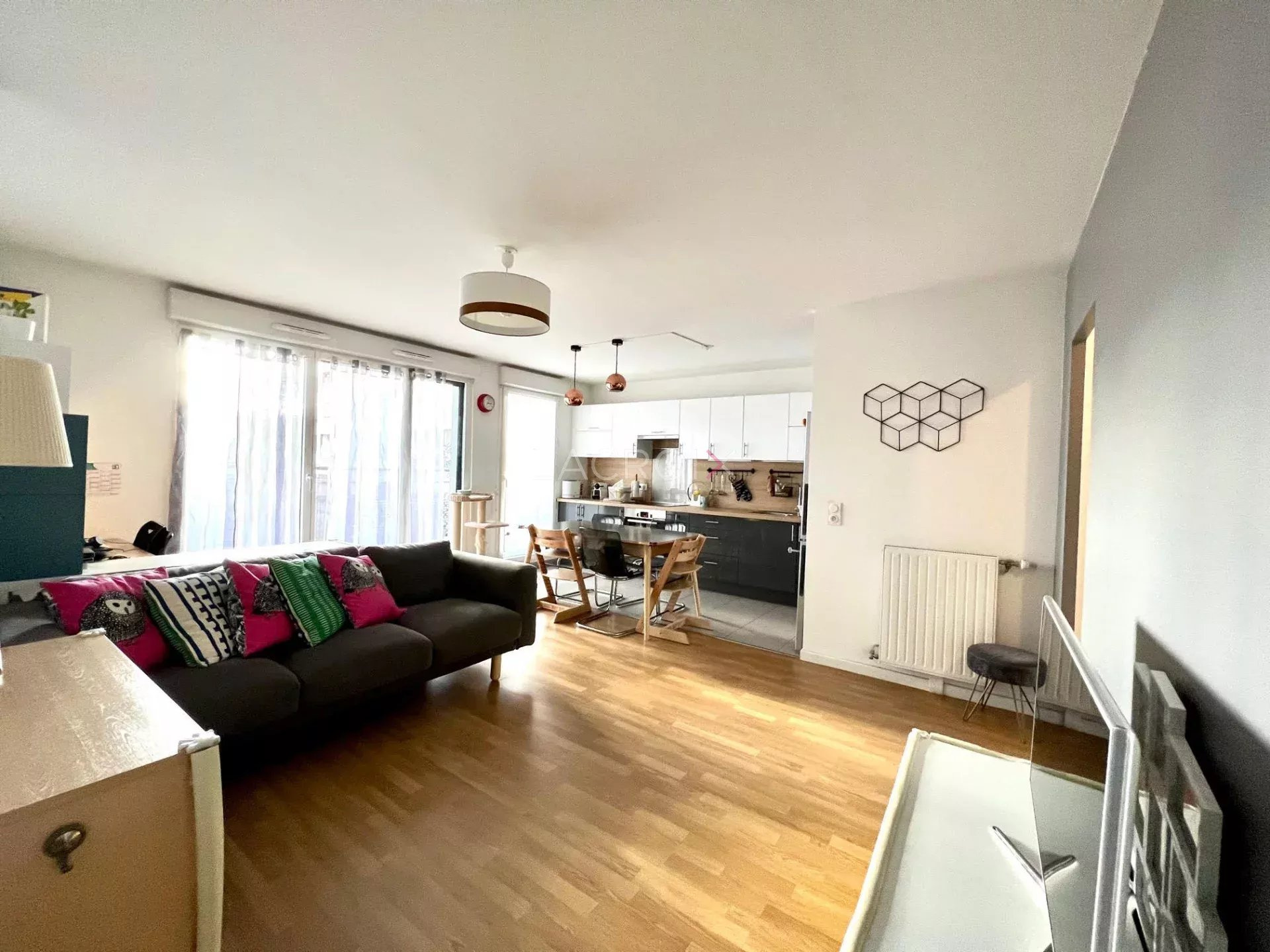 Dans l'hyper centre de Cachan et proche de toutes les commodités, à proximité de la Promenade Loing, à quelques minutes du RER B et de la future ligne 15, dans un immeuble de standing de 2015 encore sous garantie décennale, à deux pas de l'école élementaire Belle Image et du collège Paul Bert, au 2ème étage, beau 3 pièces au calme comprenant entrée donnant sur séjour avec cuisine ouverte équipée et grand balcon de 8 m2 exposé SUD, espace bureau lumineux aménagé dans le séjour, 2 chambres dont 1 avec placard, salle de bains, WC séparés. Appartement très lumineux, traversant, une place de parking en sous-sol complète ce bien.
